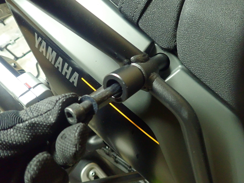 まずはタンデムステップを取り外してから、右サイドケースステーをあてがいます。